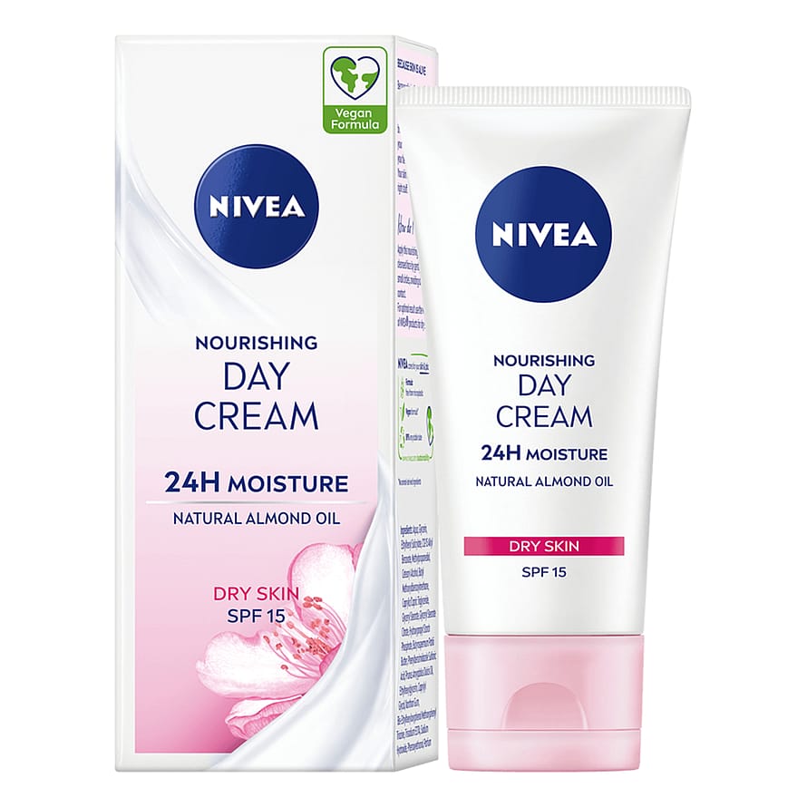 NIVEA Nourishing Day Cream är en dagkräm utvecklad för att vårda torr hud. Formulan med NIVEA Moisture care complex och naturlig mandelolja återfuktar huden intensivt i upp till 24 timmar och balanserar hudens egen fuktnivå. Denna NIVEA ansiktskräm ger näring på djupet och jämnar ut din hud samtidigt som den skyddar den från yttre påfrestningar. Dagkrämen innehåller även SPF 15 som skyddar mot skador orsakade av solen. Applicera denna återfuktande NIVEA dagkräm på rengjort ansikte genom att försiktigt massera i små cirklar. Denna ansiktsvård har en vegansk formula - fri från animaliska ingredienser. NIVEA Nourishing Day Cream är dermatologiskt testad.