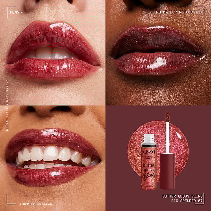 Butter Gloss-familien från NYX Professional Makeup har blivit ännu större! Nu finns nämligen den omtyckta formulan även med glitter: Butter Gloss Bling! En fantastisk produkt i vackra, glittrande nyanser som går från nästan genomskinlig till medium täckning. Läppglanset passar perfekt till alla och kan till och med användas ovanpå din favoritläpp-produkt för att ge lite extra bling.