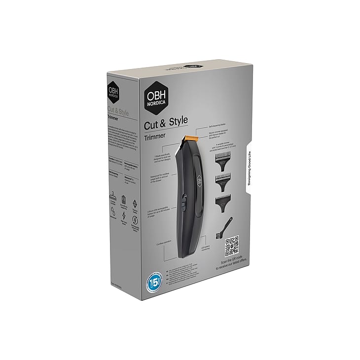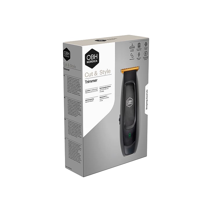 Uppgradera din trimningsrutin med vår mångsidiga trimmer Cut & Style från OBH Nordica – din pålitliga partner för en stilren look varje dag. Med tre medföljande kammar (1, 3 och 5 mm) kan du enkelt skapa en personlig och snygg stylad skägg- och hårtrimning. De titanbelagda, självslipande bladen garanterar en snygg och precis klippning varje gång.