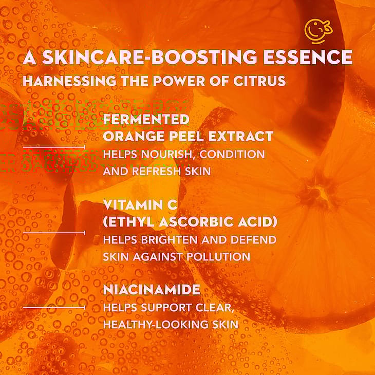 Aqua/Water/Eau, Lactobacillus Ferment, 3-O-Ethyl Ascorbic Acid, Niacinamide, Hyaluronic Acid, Sodium Hyaluronate, Panthenol, Sodium Polyglutamate, Tocopherol, Glycerin, Citrus Aurantium Dulcis (orange) Peel Extract, Citrus Aurantium Dulcis (orange) Callus Culture Extract, Citrus Sinensis (orange) Fruit Extract, Citrus Aurantium Dulcis (orange) Fruit Extract, Citrus Aurantium Dulcis (orange) Oil, Hippophae Rhamnoides Extract, Lycium Barbarum Fruit Extract, Rosa Canina Fruit Extract, Citrus Limon (lemon) Fruit Extract, Gluconolactone, Lithothamnion Calcareum Extract, Helianthus Annuus (sunflower) Seed Oil, Chondrus Crispus (carrageenan) Extract, Leuconostoc/Radish Root Ferment Filtrate, Citric Acid, Sodium Riboflavin Phosphate, Sodium Tocopheryl Phosphate, Sodium Citrate, Potassium Hydroxide, Xanthan Gum, Sodium Benzoate, Calcium Gluconate, Triethylhexanoin, Polyglyceryl-3 Laurate, Acrylates/c10-30 Alkyl Acrylate Crosspolymer, Pentaerythrityl Tetra-di-t-butyl Hydroxyhydrocinnamate, Phenoxyethanol, Chlorphenesin, Triethyl Citrate, Limonene, Linalool, Citral.