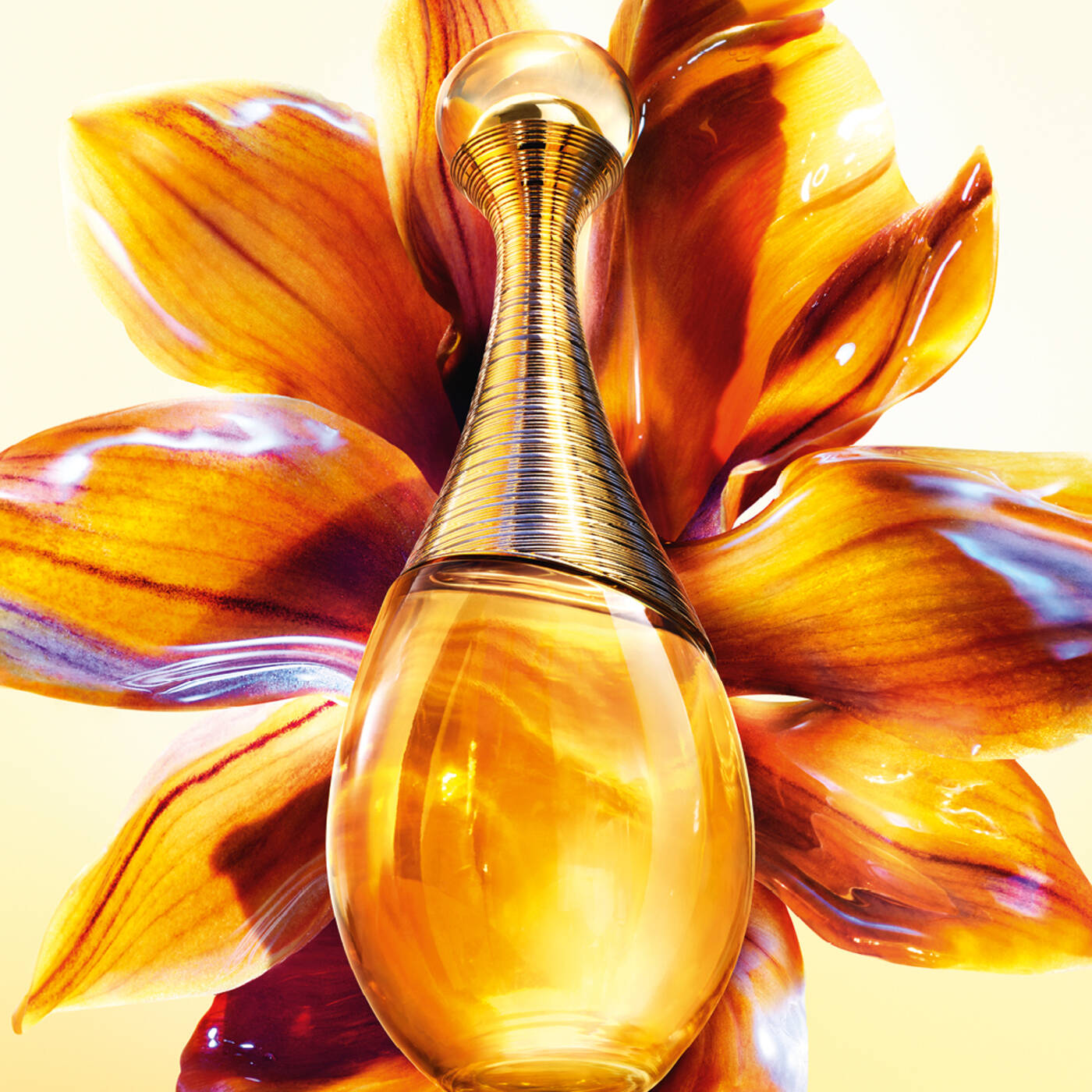 Dior J’adore parfymflaska tillsammans med en person som bär guldfärgat smycke, med texten “j’adore”, “DEN NYA INTENSIVA” och “DIOR”.