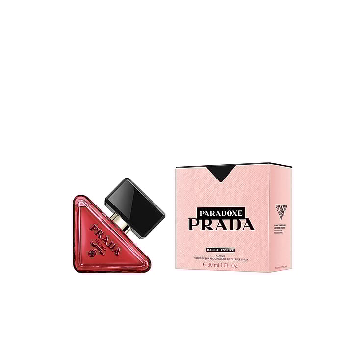 I likhet med den originala doften är den förnyade flaskan ett uttryck för husets essens av återuppfinning. Minimalistisk och delikat vid första anblick, inspirerad av den ursprungliga ikoniska Prada-triangellogotypen, som är designad för att vila på sidan. Prada-vapenskölden står i kontrast till flaskans sofistikerade, djupt rosa lackering. Paradoxe Radical Essence ytterförpackning är präglad för att spegla varumärkets signatur Saffiano-lädermönster. Ett samspel mellan doftens rosa signatur och den svarta Prada-logotypen, med Paradoxe-etiketter i svart för att spegla den maximala intensiteten i denna radikala essens.