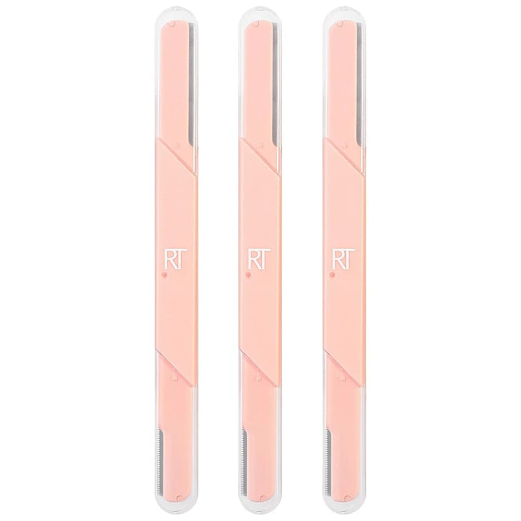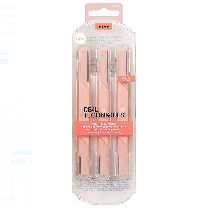 Med Real Techniques Face and Brow Razors avlägsnar du enkelt döda hudceller och oönskat ansiktshår för en slät hy som är redo för makeup. Ett viktigt steg för att få en slät och jämn makeup är just att ta hand om din hud. Låt din fräscha, naturliga hud skina igenom! Perfekt produkt för alla hudtyper. Dessa rakhyvlar har dubbla ändar - det större bladet är avsett för hela ansiktet och det mindre bladet är avsett för bryndetaljer.