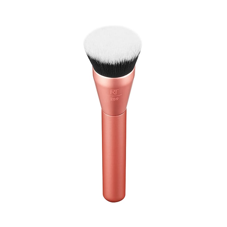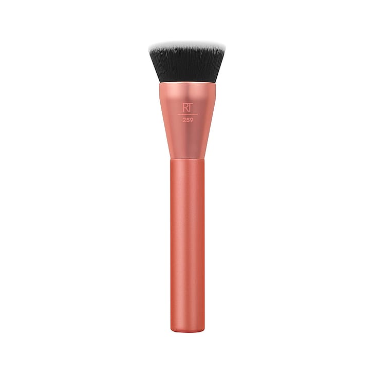 Real Techniques Glow Round Base Makeup Brush har ett platt borsthuvud som enkelt polerar ut och blandar foundation jämnt och ger en slät airbrush-liknande bas. Borste 259:s form gör att man enkelt kan jobba med stora ytor åt gången och att man kommer åt svåråtkomliga områden i ansiktet, så som runt ögonen och näsan. Vår foundationborste används bäst med flytande- och krämprodukter. Med maximal upptagning av produkt, precisionsapplicering och former som underlättar appliceringen – kommer denna tredubbla design att höja din dagliga sminkrutin. Glow Round Base Makeup Brush har en NY specialskuren rund form med en platt topp och UltraPlush högkvalitativa täta borststrån för maximal upptagning av produkt, som ger ett airbrush liknande resultat. Som med alla våra RT-produkter är denna sminkborste 100% vegansk och cruelty-free.
