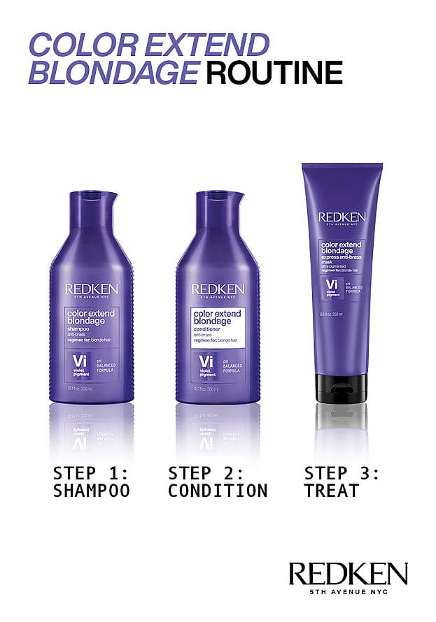Redken Color Extend Blondage Shampoo är ett färgbevarande och neutraliserande lila schampo för blont och slingat ljust hår. Detta schampo har en färgkorrigerande formula, som innehåller bland annat veteprotein och aminosyra, som hjälper till att stärka blont hår. Den innehåller även violetta pigment som neutraliserar och avlägsnar oönskade gula och orange toner. Blont hår blir kallare och ljusare i tonen. Schampot rengör håret varsamt och gör det mjukt.