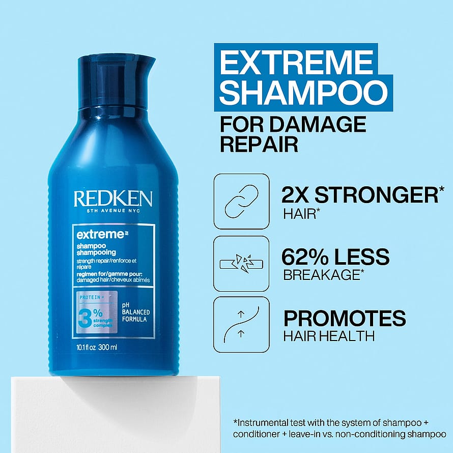 Redken Extreme Shampoo rengör, stärker och hjälper att återuppbygga skadat hår. Proteinberikad formula som hjälper att förebygga skadat hår och kluvna toppar. Håret känns sundare och starkare.Redken Extreme Shampoo är särskilt framtaget för torrt, skört och skadat hår. Den innehåller Redkens Strength Complex, som innehåller aminosyror och arginin, vilket rengör skonsamt och tillför näring till håret för att ge styrka och motverka brustna hårstrån. Proteinet hjälper att förebygga kluvna toppar, medan citronsyra hjälper att balansera hårets pH-värde, vårda och tillföra mjukhet, vilket gör att håret känns sundare och starkare.