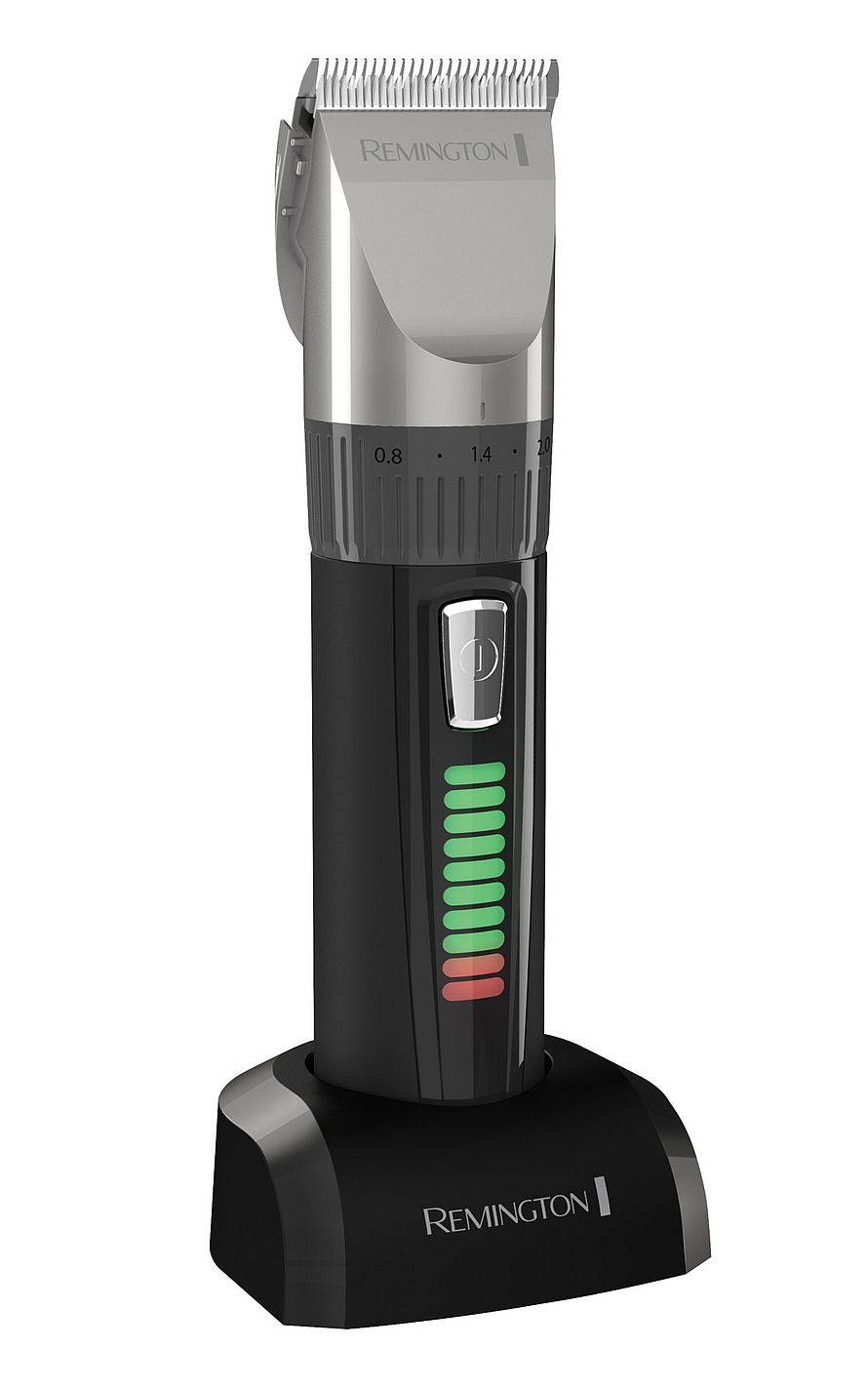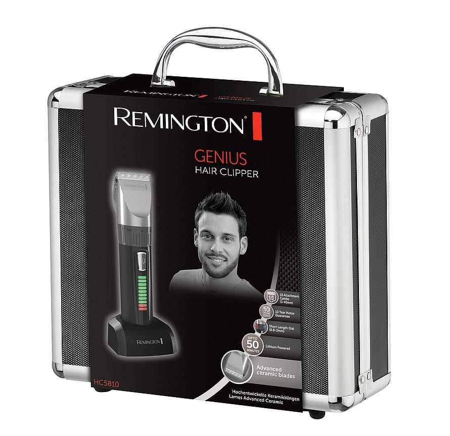 Remington HC5810 Genius Hårtrimmer. Självslipande keramiskt belagda skär som inte blir lika varma som traditionella stålblad eller titaniumblad. 10 fasta kammar för olika hårklippningslängder (3-40mm) samt en justering för precision (0,8 - 2 mm). Lithiumbatteri och sladdlös användning upp till 50 min men funkar även med sladden i. Laddningsstation, aluminiumväska utrustad med sax, kam, nackborste medföljer.