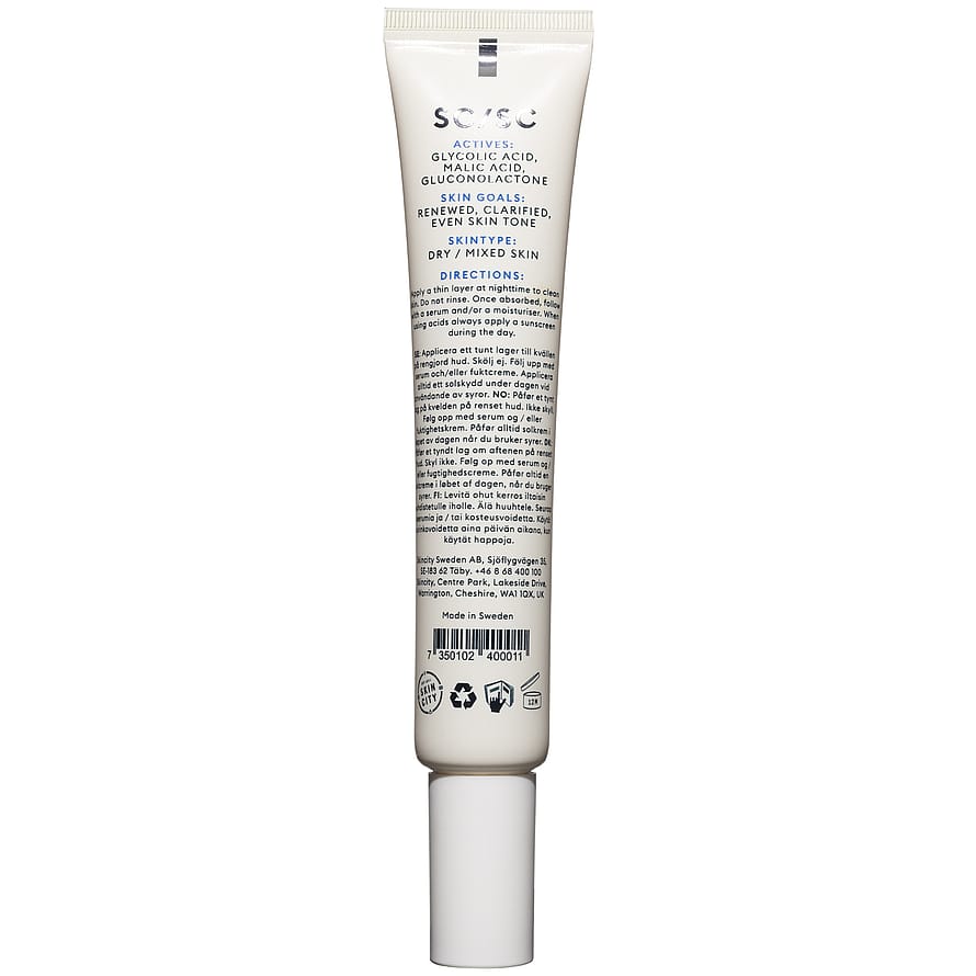 Applicera ett tunt lager på torr och rengjord hud, med fördel på kvällen. Låt absorberas av huden och följ sedan upp med koncentrat och/eller återfuktande creme. Ska ej sköljas av. Vänj in huden genom att applicera exfolieringen 1 gång i veckan beroende på om du har en känslig eller tålig hud. öka sedan försiktigt upp användandet till 2-3 gånger i veckan beroende på ditt behov och hudtillstånd. Applicera alltid ett högt UV-skydd som sista steg dagtid när du använder produkter med syror, då huden kan bli mer solkänslig. Det är viktigt att återapplicera under dagen för att få ett optimalt skydd. Vid aktiv solning rekommenderar vi en paus från syror.