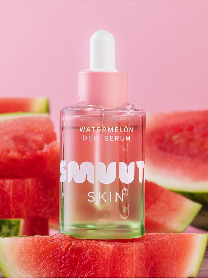Smuuti Skin Watermelon Dew Serum är ett fuktboostande serum som återuppliver trött och torr hud. Serumet innehåller hyaluronsyra i tre olika molekylstorlekar, vilket hjälper den fuktbindande ingrediensen att penetrera djupare ner i huden. Niacinamid (vitamin B3) har en uppljusande och slätande effekt som förstärker hudens lipidlager, vilket agerar som hudens naturliga barriär mot externa stressfaktorer. Därmed förebygger niacinamid täppta porer och akneärr. Serumet innehåller också uppfriskande och återfuktande vattenmelonextrakt, glycerin samt lugnande och förstärkande centella asiatica. Utan ingredienser av animaliskt ursprung, oparfymerad. Passar alla hudtyper.