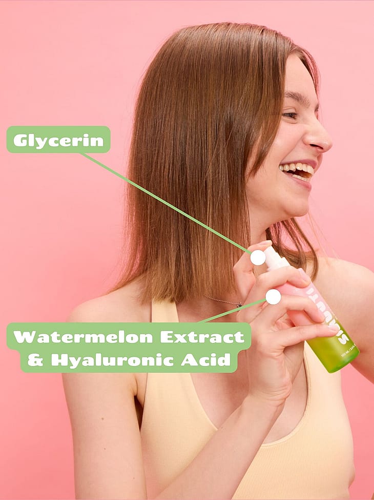 Smuuti Skin Watermelon Dew Toner Mist fräschar upp och återfuktar ansiktet omedelbart. Extrakt av vattenmelon, glycerin och hyaluronsyra ger en kraftig dos av fukt. Centella asiatica lugnar, balanserar och förstärker huden. Denna mångsidiga hudvårdsprodukt kan användas som toner eller som mist vid behov av en fuktboost under dagen. Produkten förbereder huden för andra steg i hudvårdsrutinen men kan också sprayas över makeup. Utan ingredienser av animaliskt ursprung, oparfymerad. Passar alla hudtyper.