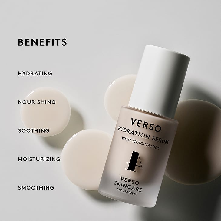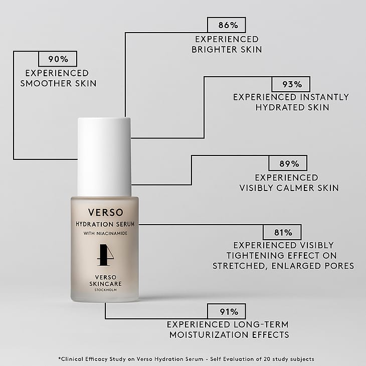 Verso Hydration Serum är ett intensivt återfuktande och parfymfritt serum som effektivt bekämpar torr hud. Formulan innehåller en hög halt av niacinamid (vitamin B3) som balanserar, minimerar porer, reducerar fina linjer och ger ökad lyster. Nordisk havre förbättrar hudens fukt- och näringsbalans, samt motverkar irritation orsakad av torrhet och miljöpåverkan. Hydrolyserat jästextrakt ger maximalt med fukt och minimerar torrhet och fina linjer, vilket ger en fastare hud med ökad fyllighet och spänst. Serumet passar alla hudtyper, men är särskilt bra för en torr och stressad hud med rodnad.