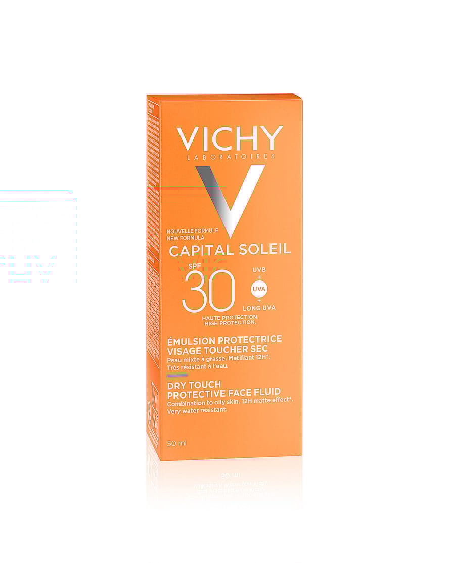 Vichy Capital Soleil Dry Touch SPF30 är en mattande solkräm för ansiktet avsedd för kvinnor och män som har en tendens att få blank och glansig hud i solen. Solkrämen absorberas snabbt och är vatten- och svettresistent. Lämplig för känslig hud.