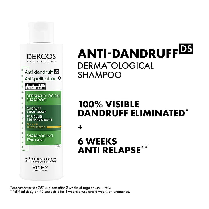 DERCOS Technique Mjällschampo för torrt hår hjälper till att reducera upp till 100 % av synligt mjäll* samt förebygger återkomst av mjäll i upp till 6 veckor. Motverkar känslan av obehag och klåda orsakad av mjäll. Bygger på Selendium DS-teknologi*** som rengör och hjälper till att bevara den naturliga balansen i hårbotten. DOKUMENTERAD EFFEKT: Avlägsnar synligt mjäll efter första användningen och lugnar omedelbart. Torkar inte ut huden.
