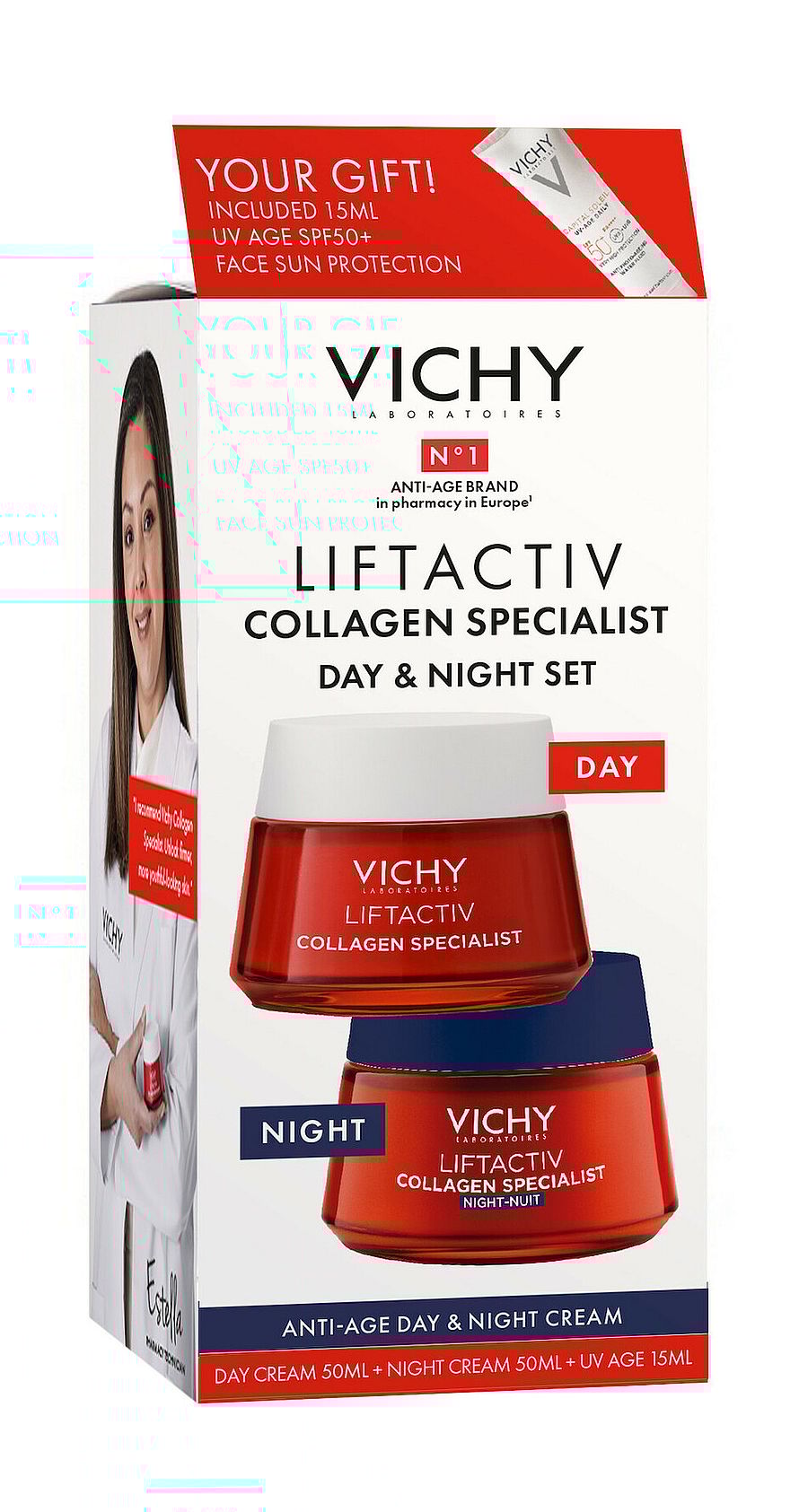 LIFTACTIV COLLAGEN SPECIALIST DAG & NATT SET: Avancerad anti-ageing för att motverka synliga ålderstecken och pigmentfläckar. Din hjälp för mer spänst och strålande hud! Få definierade konturer och en jämnare hudton, bekämpa kollagenförlust, fina linjer, rynkor och pigmentfläckar. Med pro-kollagen peptider, Cg-vitaminer och Niacinamid – stärk, återfuktar och återställer din huds barriärfunktion och elasticitet. Prova Liftactiv Collagen Specialist idag och upplev revitaliserad och fastare hud.
