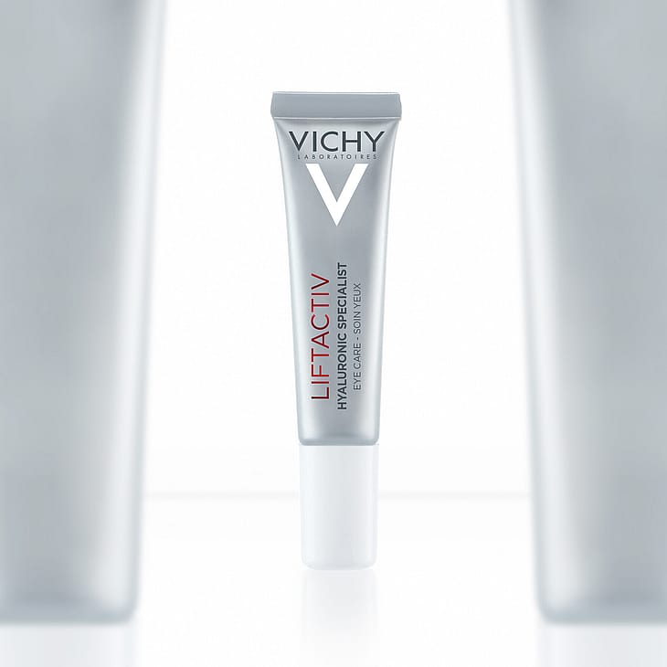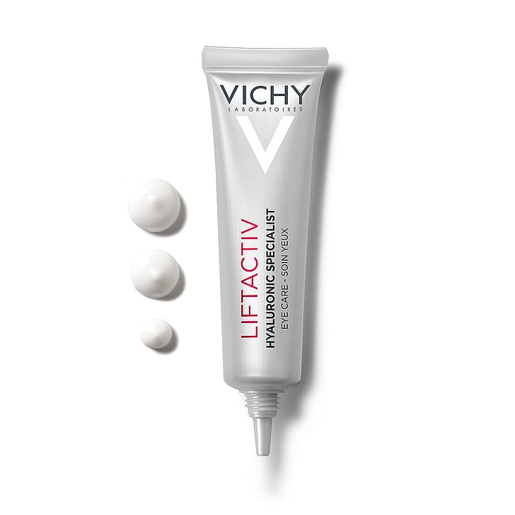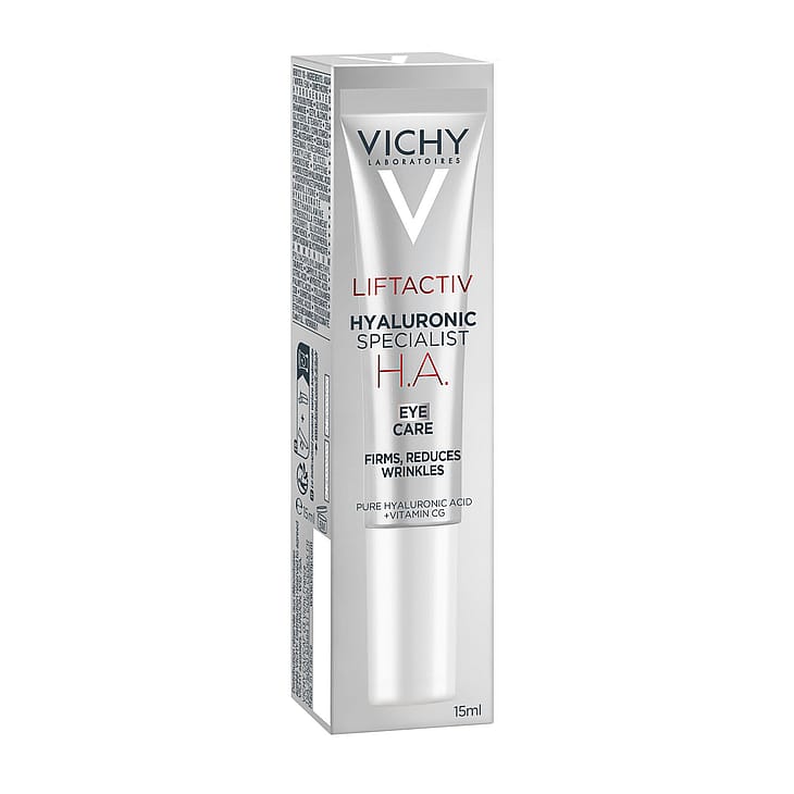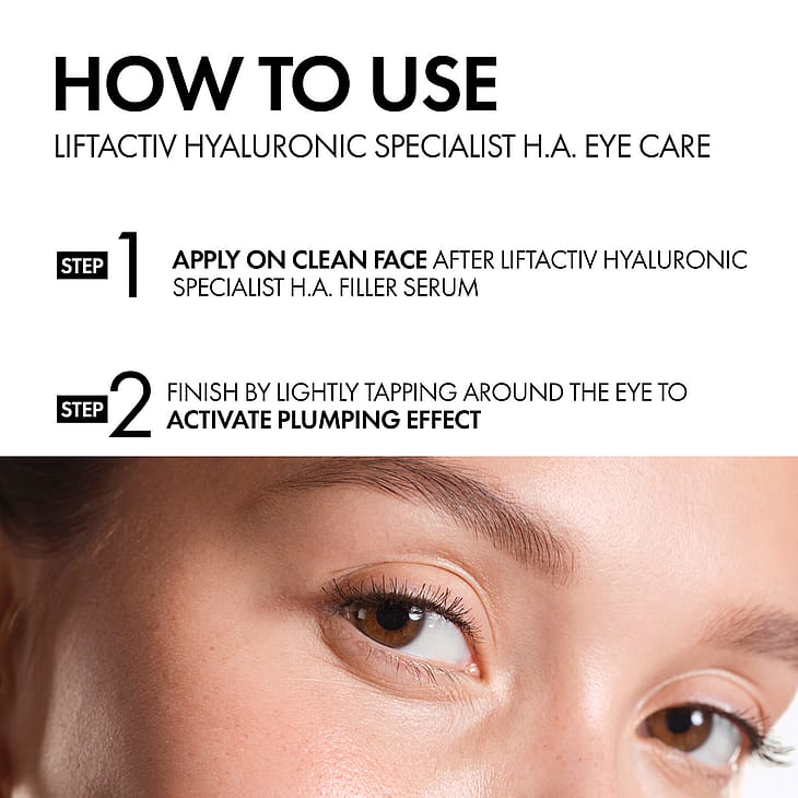 LIFTACTIV HYALURON SPECIALIST H.A. -ÖGONKRÄM. Dag efter dag reduceras kråksparkar, svullnader runt ögonområdet och mörka ringar upplevs som mindre synliga. Med aktiva ingredienser: hyaluronsyra, vitamin Cg och koffein. Ögonkonturen upplevs omedelbart slätare.Huden känns omedelbart mjukare och behagligare och ser slätare ut*. Produkten absorberas snabbt och klibbar inte*. På bara 4 veckor är kråksparkar och rynkor runt ögonen mindre synliga. Huden ser slätare och fastare ut samtidigt som mörka ringar upplevs mindre*. *Självutvärderingar (N53)