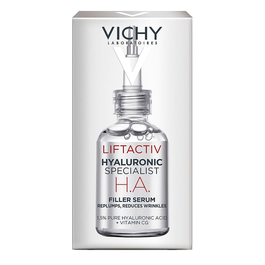 Vichy Liftactiv Supreme H.A. Epidermic Filler är ett intensivt anti-age serum för ansikte och den känsliga huden runt ögonen. Det innehåller bland annat 1,5 % hyaluronsyra, samt vitamin C och vulkaniskt vatten från Vichy som fyller huden med fukt och får den att se fylligare och slätare ut.