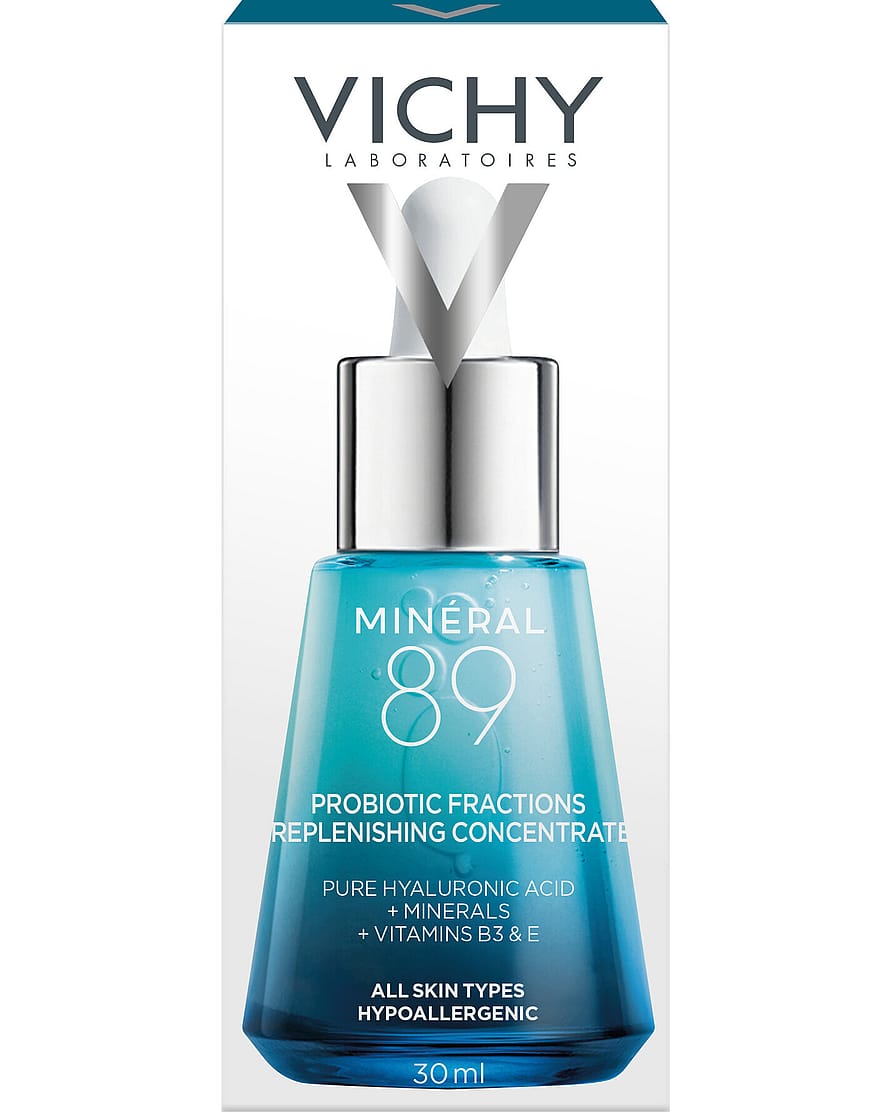 Vichy Mineral 89 Probiotic Fractons Serum är ett förnyande serum anpassat för försvagad och stressad hud. Serumet har dokumenterad effekt på bekymmerslinjer, förlorad elasticitet och lyster. Formulan med bland annat hyaluronsyra, vitamin E, probiotiska fraktioner, niacinamid samt vulkaniskt vatten från Vichy, får huden att kännas mjukare och slätare med ny lyster. Den lätta konsistensen absorberas snabbt.