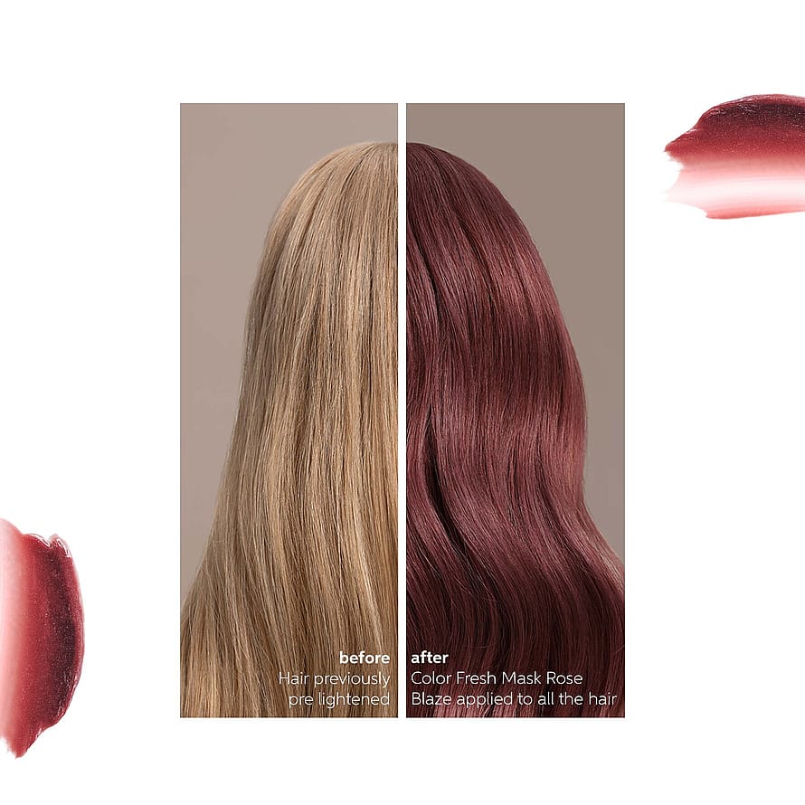 Wella Professionals Rose Blaze Color Fresh Mask är en färginpackning och glansbehandling som inte skadar håret och som är utformad för att bevara, omvandla eller förstärka din salongsfärg. Rose Blaze är perfekt för att skapa djuprosa toner i mellanblont och förblekt hår. Ju ljusare hår, desto färgstarkare nyans. Den temporära färgmasken bleknar gradvis och de rika vårdande ingredienserna i formulan gör att håret känns mjukt och återfuktat, så det finns inget behov av att använda ett balsam. Behandlingen för hemmabruk är utformad för användning en gång i veckan med synliga resultat på 10 minuter och en ton-i-ton-blekning. Wella Color Fresh Mask är berikad med avokadoolja och framtagen utan animaliska ingredienser och silikoner.
